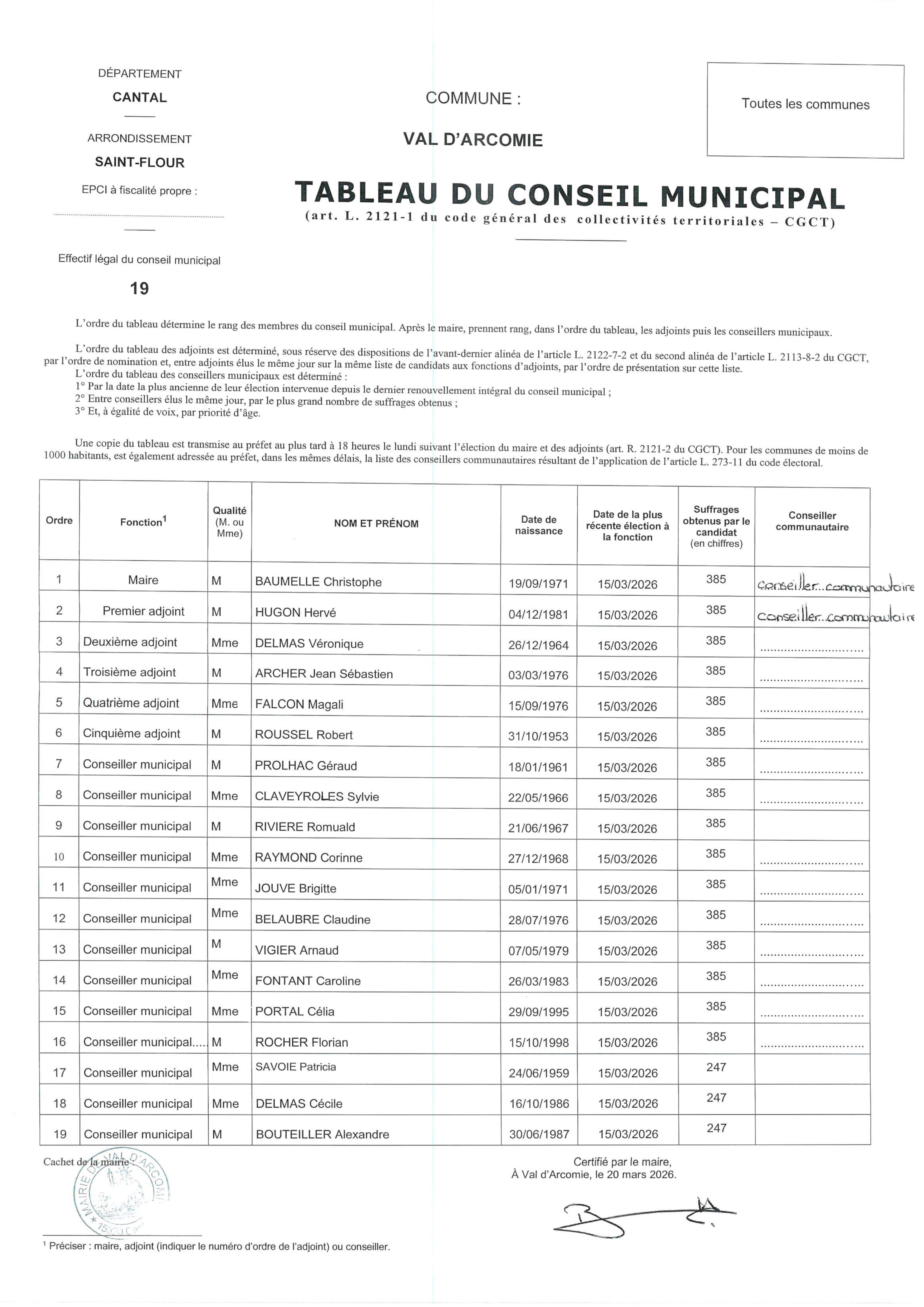 Le vendredi 20 mars 2026 a eu lieu, à la salle de Loubaresse, le conseil municipal dit “d’installation”. C’est lors de ce premier conseil municipal que les 19 élus choisissent d’élire le Maire, les adjoints et délégués communautaires.