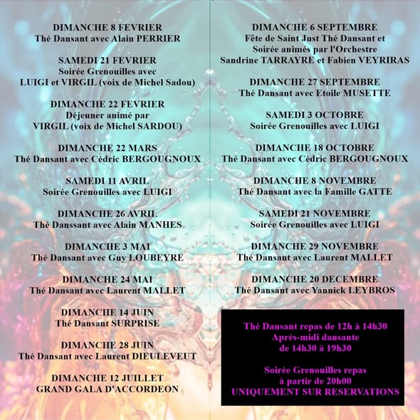 Bar-Restaurant. Restauration traditionnelle, repas de groupe, salle de dancing, animation les week-ends (soirées dansantes ou soirées à thème, thés dansants tous les dimanches , le programme 2023 est visible en cliquant sur cette image).