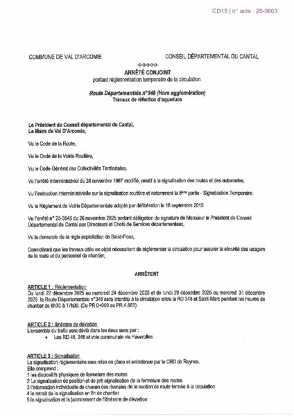 • Route RD348 barrée (St Marc / Croisement de Bournoncles) du 22 au 24 décembre 2025 et du 29 au 31 décembre 2025 pendant les heures de chantier (8h30 à 17h00)